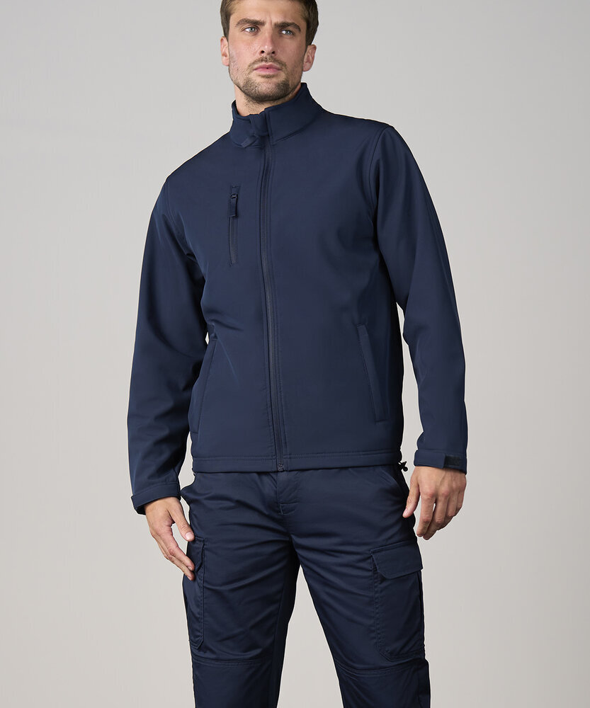 Standard fit. Full-zip front. Zipped chest and side pockets. Printable three-layer binded softshell fabric. Chinguard. Internal storm flap. Adjustable shock cord hem. Windproof and showerproof.