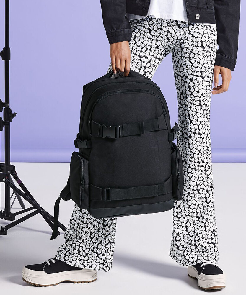 TearAway label for ease of rebranding. Laptop compatible up to 17'. External access padded laptop compartment. Skateboard carry straps. Internal organiser section. Zippered front pocket. Zippered side pockets. Padded back panel. Compression straps. Padded adjustable shoulder straps. Grab handle.